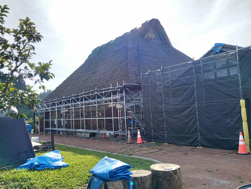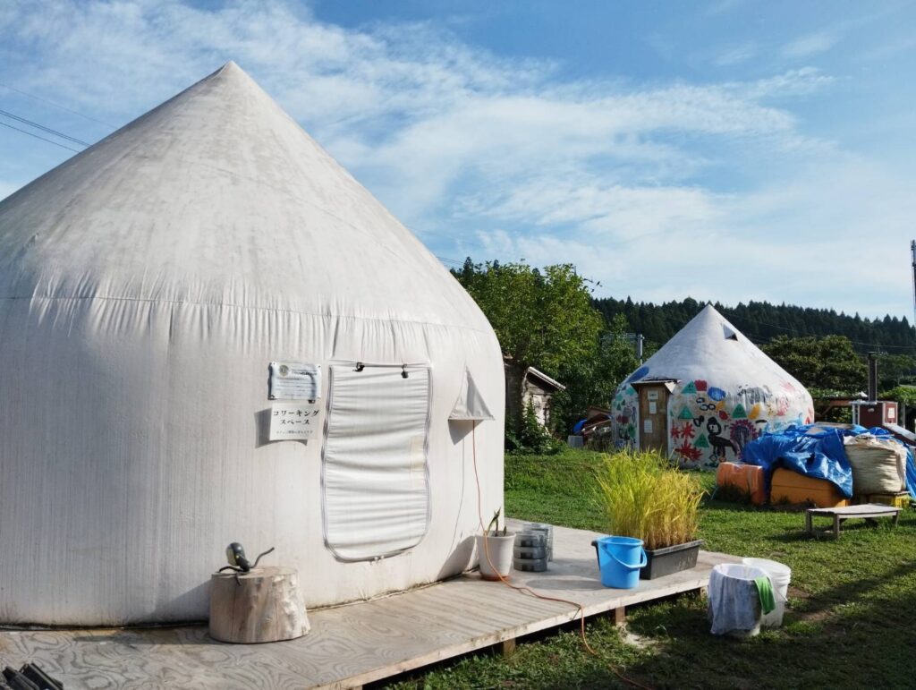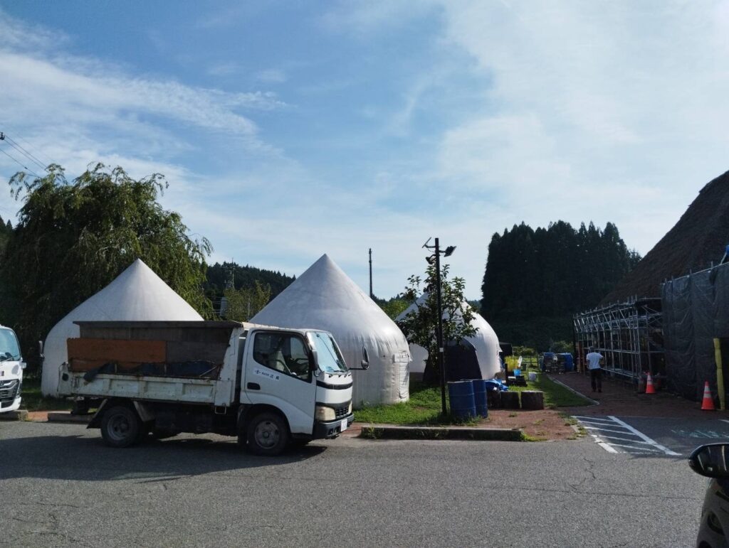大きな茅葺き屋根の立派な建物がボランティアさん達の基地になっており、その周りに倉庫や色々な事をする為のドーム型のテントが点在していました。