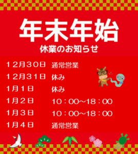 さて、年末年始の営業の予定を今回はお伝えさせていただきます。