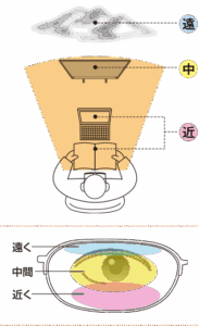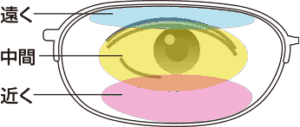 お手元周りを見やすくする中間、近くのエリアが少なめ。遠く重視のレンズです。